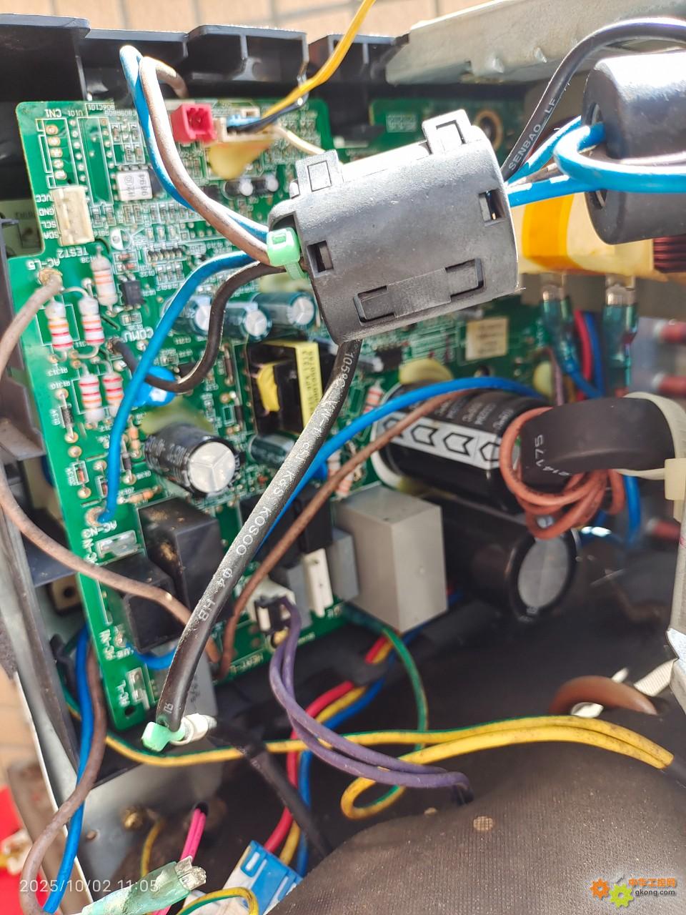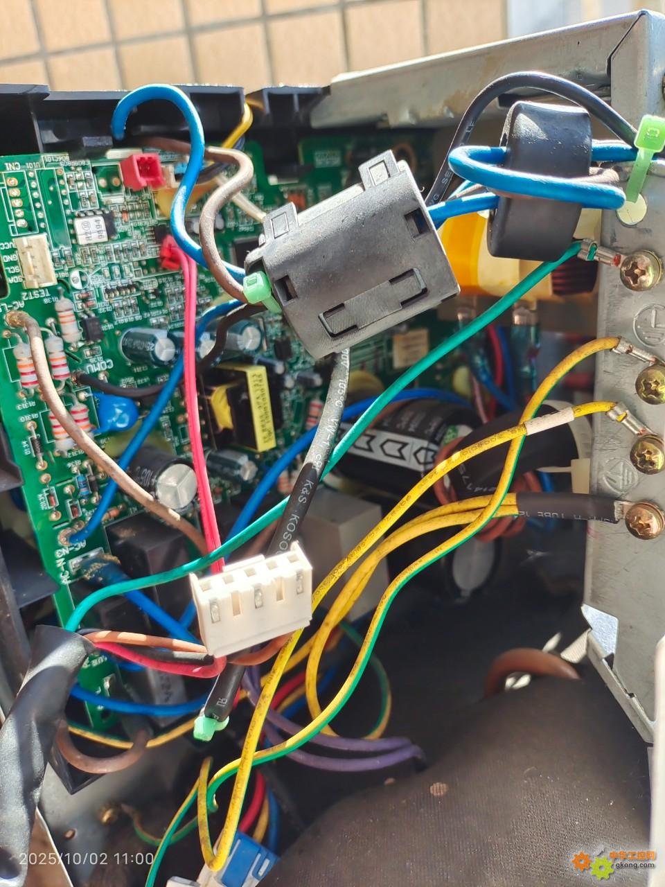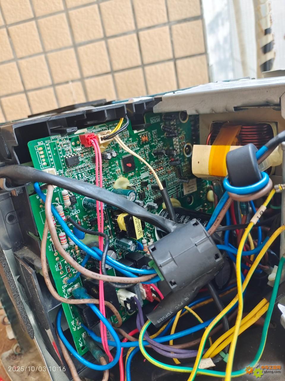 国庆假期哪儿都没去,猫在家里修空调,格力空调报警E6,2012年安装的,叫了外面修空调师傅,说是外机主板坏了,更换一块600元,于是拆下来了单独通电检查,上电闪黄灯,检测各路电压正常,再装上去通电开机,外机板灯不亮,检侧N-S端有直流30-39V电压跳变,N-L端交流电压235V维修陷入困境,不知道究竟哪里出问题,过了一晚,第二天还是没找到问题,再次拆下外机板通电,黄灯亮,装上去又不亮,不敢怀疑是内机至外机线断,原装线四芯2.5平方,质量很好,一直折腾到下午,决定还是换线试一下,去镇上花25元钱买了5米1.5平方三芯电缆,换上去试机,外机嗡一下就启动了,观察了很久,外机板黄绿红三个灯同时秒闪烁,很快内机出水,制冷正常,成功修复。