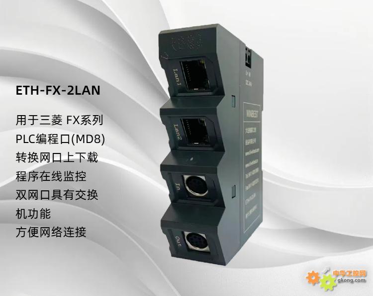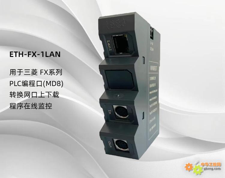 3、将三菱FX系列PLC的MD8编程通讯口转成以太网,即编程软件/上位机软件或触摸屏通过以太网对 PLC数据监控。