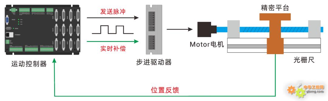 传统步进系统采用开环控制,脉冲指令与传动平台末端位移的最终位置可能并非是目标位置,易受传动链误差及负载扰动影响而产生定位偏差。通过外置光栅尺后,可直接反馈负载的实际位移,控制器基于位置误差实时修正脉冲输出,实现平台末端的全闭环高精度运动控制。
