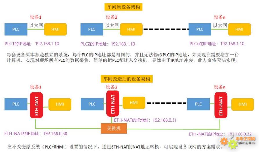车间多个设备,如果具有相同的IP地址(现场PLC IP地址无法更改),则可以统一成同网段不同的IP地址,进行数据采集。