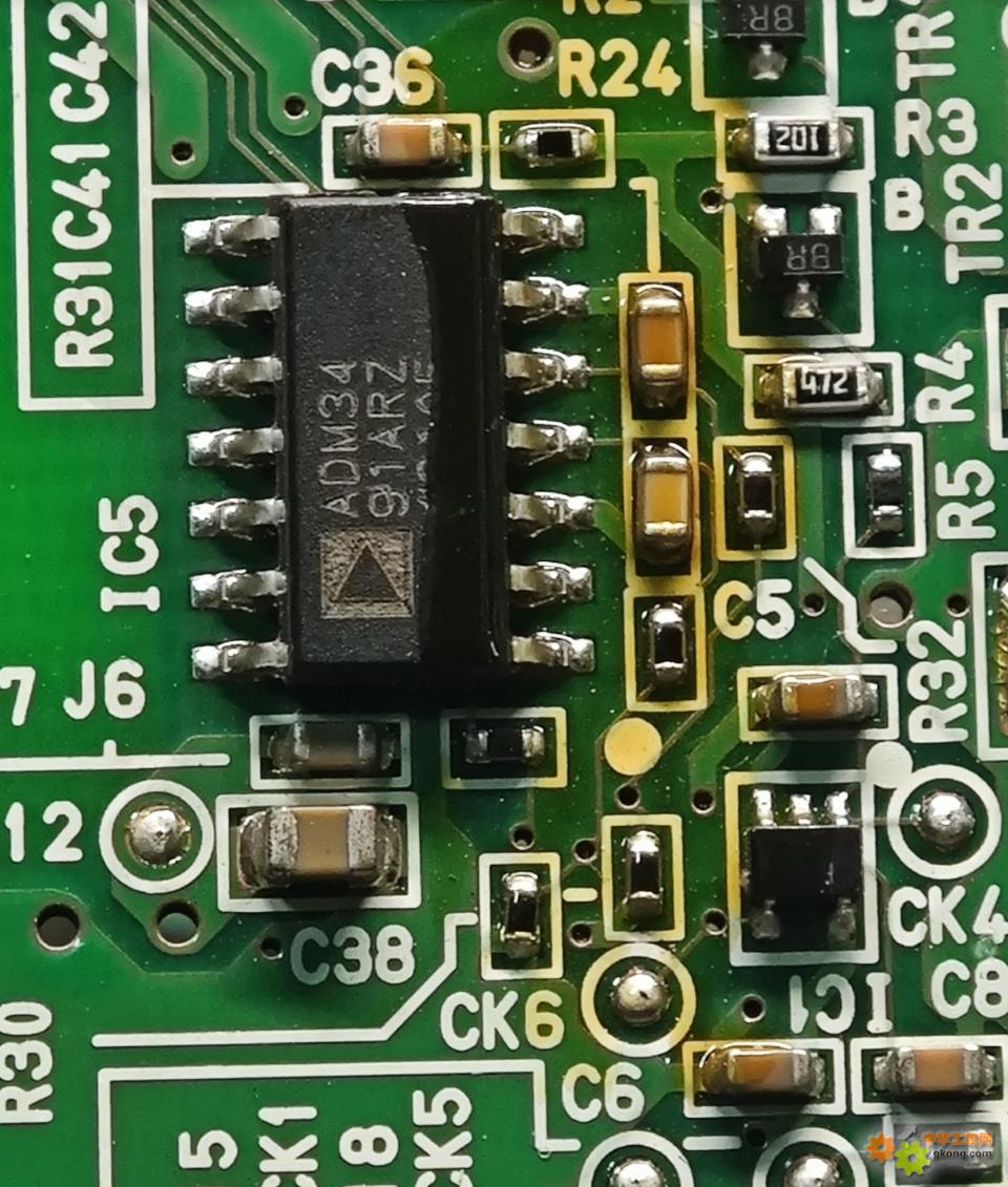背面:RS485 芯片 ADM3491 <ADM3491 是 ADI(亚德诺)推出的 3.3V 供电全双工 RS - 485/RS - 422 差分线路收发器,最高数据速率 10Mbps,工业级温度范围,集成热关断与失效保护,适合工业控制、通信网关等低功耗总线通信场景>。