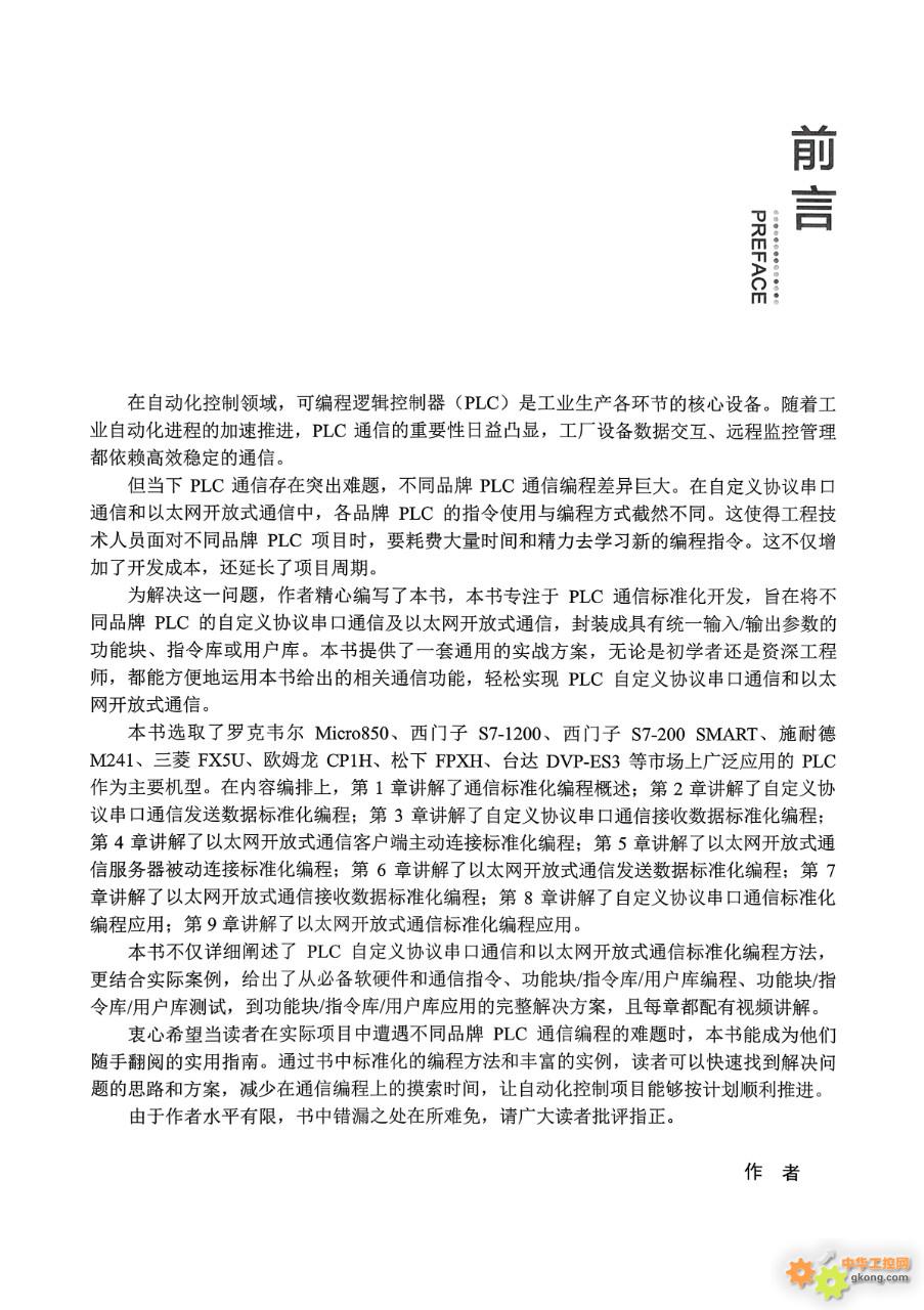 为解决这一痛点,作者关普精心编撰《PLC通信标准化开发实战》(机械工业出版社出版)。本书核心定位聚焦PLC通信标准化开发,通过科学封装,将各类主流PLC的自定义协议串口及以太网开放式通信功能,统一封装为标准化输入/输出参数的功能块、指令库或用户库。无论初学者还是资深工程师,均可借助本书通用实战方案,无需反复学习不同品牌指令,就能高效实现PLC通信开发,真正做到“一次学习,多品牌通用”,提升效率、降低成本。