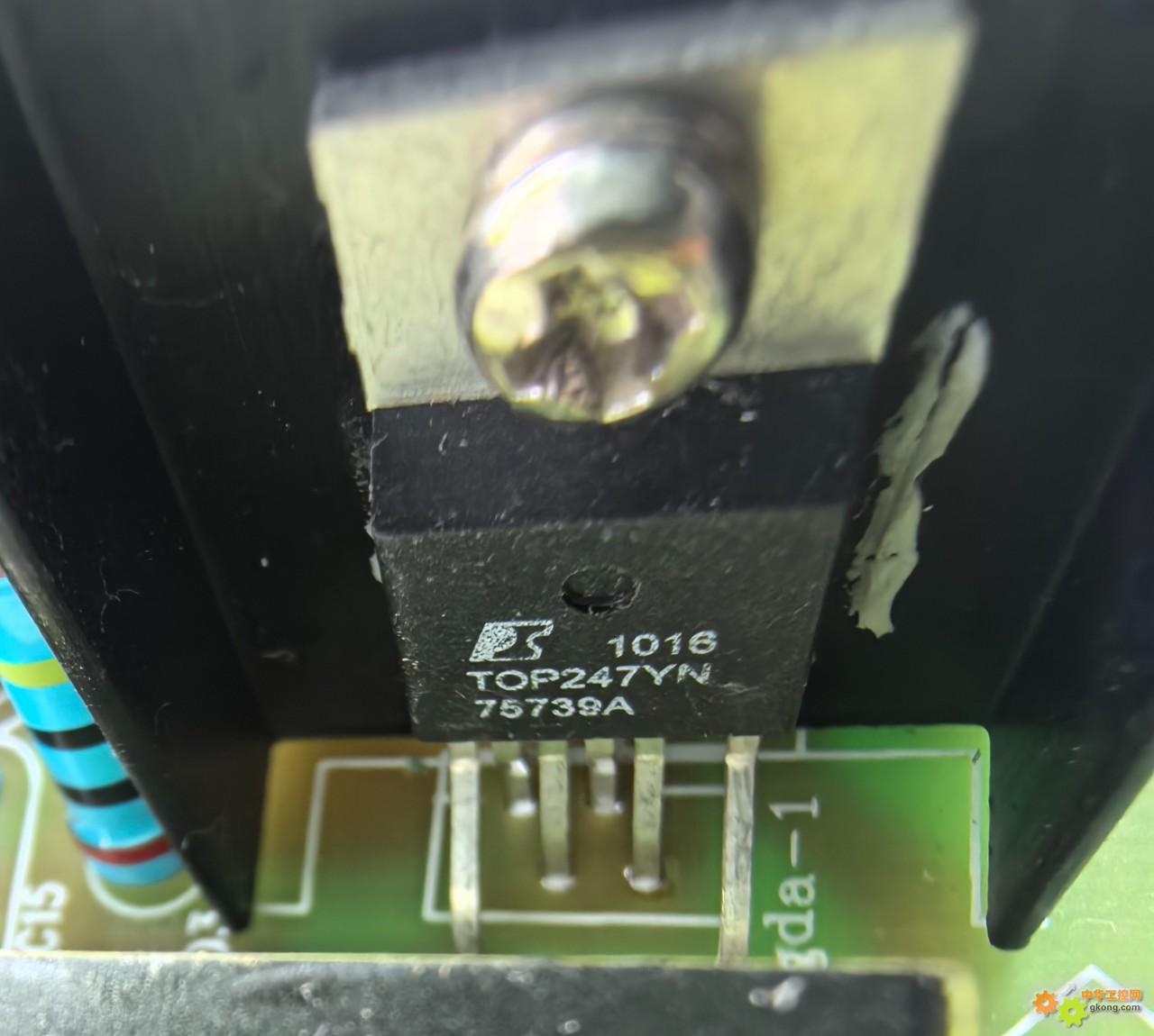 2、今天,上电开机,听到“啪”一声,没反应。开盖检查,发现电源管TOP246YN爆了。用TOP247YN更换,正常。