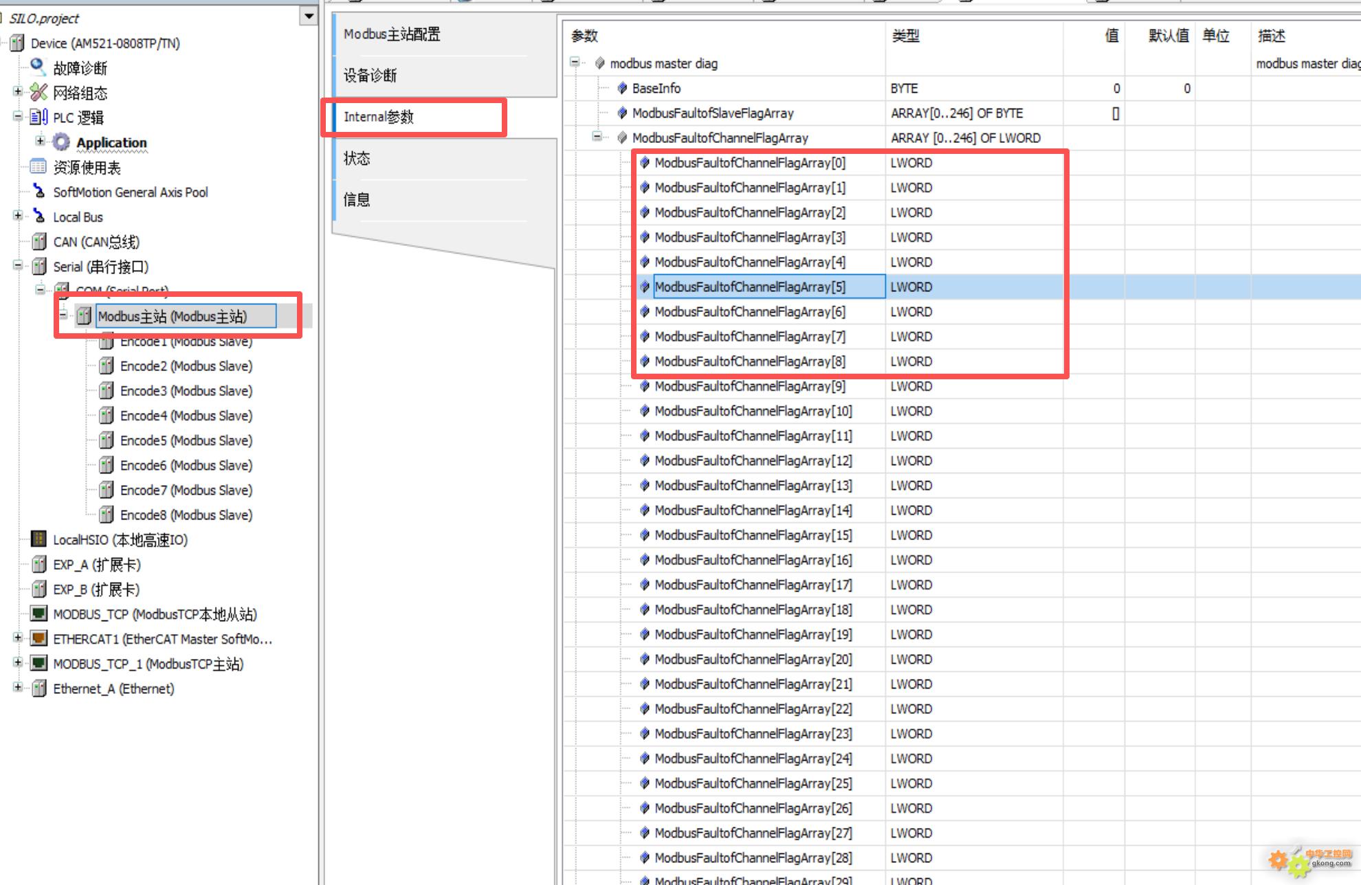 这里的modbusFalutofSlaveFlagArray和ModbusFaultofChannelFlagArray两个数组,能反映通讯状态,但这个标签在程序中不能引用。