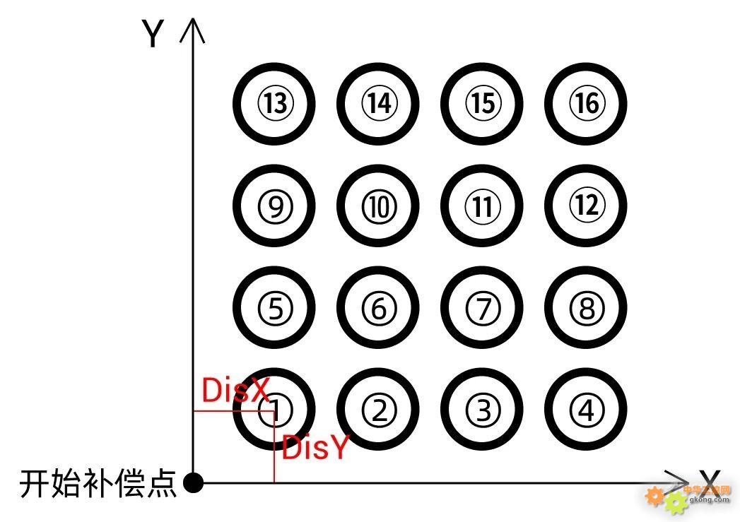 6.如下图假设开始补偿点是坐标系的原点,补偿间距分别是【DisX,DisY】补偿的点是【4*4】的话,螺距补偿表存储的点位数据就是以下【点1】到【点16】的位置下的补偿数据。