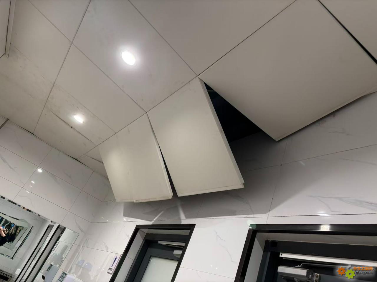 洗手间靠卫生间一侧整个一片天花板都坠下来了,天花板附着的墙砖都是空的。估计有以下原因:一个是敷设天花板所用的主副龙骨太单细,麻花一样 ,一个是墙砖空鼓脱落导致天花板受压下坠,还有就是最近两天厂房内开了通风,风压比较大的原因。