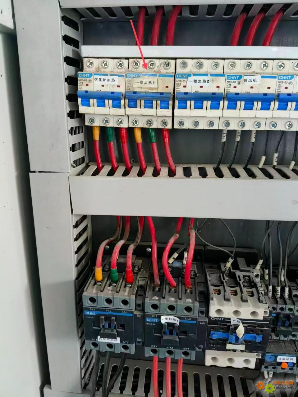 如图,一台去年10月刚投产的设备。加热靠接触器控制。断路器为d63a,负载为三只6kw的加热管用钳形电流表测工作电流为29a左右。三相平衡。加热管经测量完好。。如图某泰d63a的断路器老是跳闸。换了两个某泰同型号d63a了。有时候还是会跳。跳了之后还能合上。能正常工作