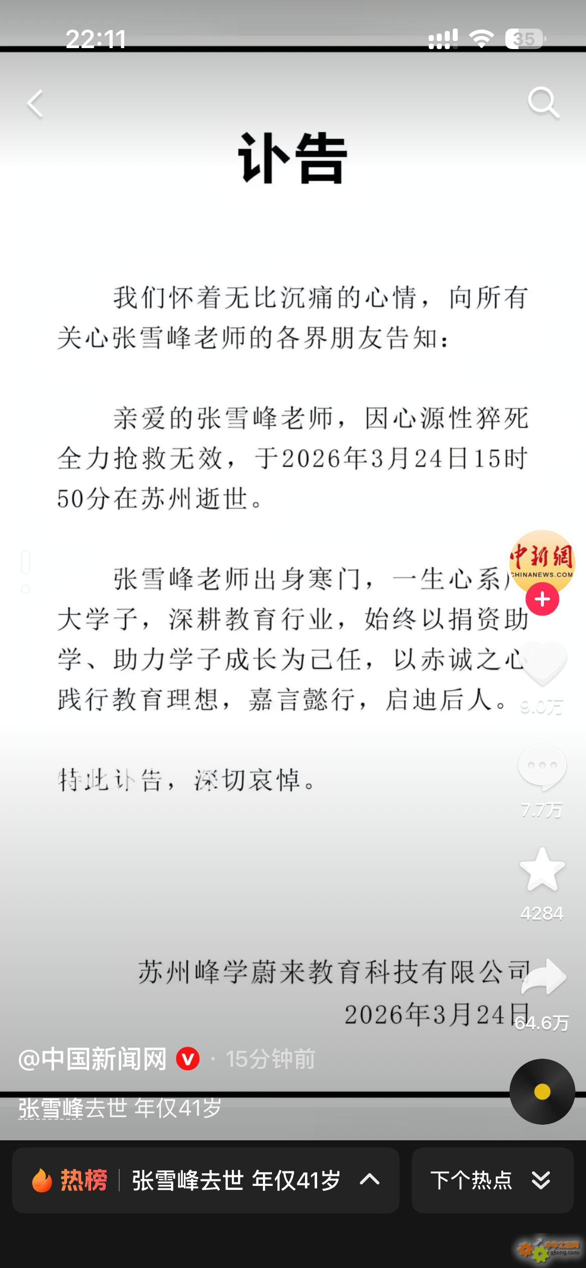 张雪峰噶了吗