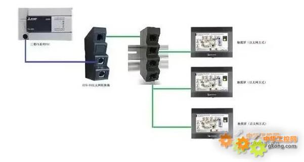 我们针对客户的需求,配置了ETH-FX转换器,中间再加上一个普通的工业交换机,就可以将本身不太网口的ETH-FX系列PLC(FX1N/1S/2N/3S/3G/3GC/3U/3UC)转成以太网后,与触摸屏或者是上位机实现以太网方式的通讯,连接图如下,供有类似需求的客户参考。