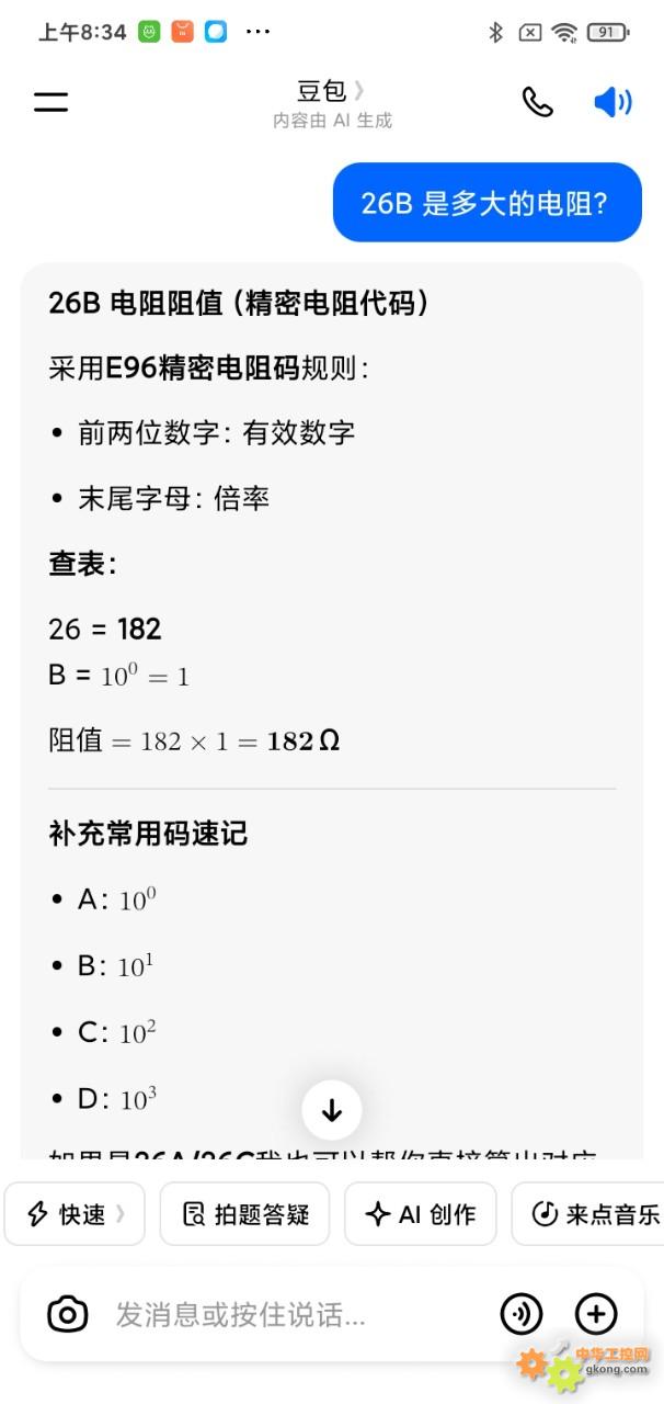 今天用豆包查E96电阻码,26B豆包查表是182欧,下面补充A,B,C,D明显错误!