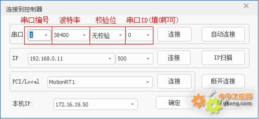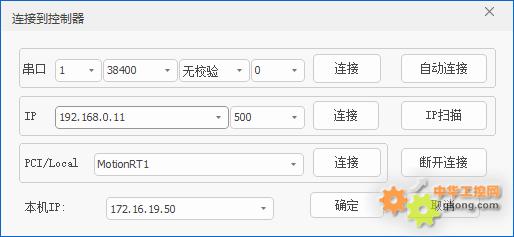 控制器出厂的默认IP地址为192.168.0.11,“连接到控制器”窗口能显示出本机IP地址,电脑需要设置IP地址与控制器IP处于同一网段才能连接,即四段的前三段要相同,最后一段不同才可通讯。