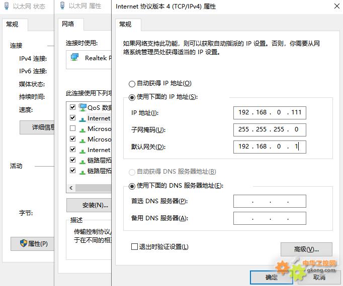 查看电脑本地IP协议版本4地址是否为192.168.0.xxx,前三段与控制器一致,最后一段不能一样,控制器出厂默认IP:192.168.0.11。如果IP地址的第三段不一样,则需要将对应的子网掩码改为0。设置好之后再进行软件连接。