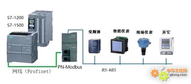 实现功能:用于西门子S7-200Smart /S7-1200/S7-1500/S7-300PN,通过Profinet 网线与本产品PN-Modbus连接,实现与现场设备、变频器、仪表、PLC、DCS进行Modbus RTU通信。