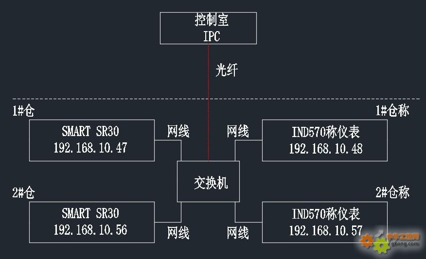 现场我方设备,SMART SR30作为PROFINET控制器,托利多称仪表IND570作为PROFINET智能控制器,组成两套独立系统分别控制两料仓进出料计量。