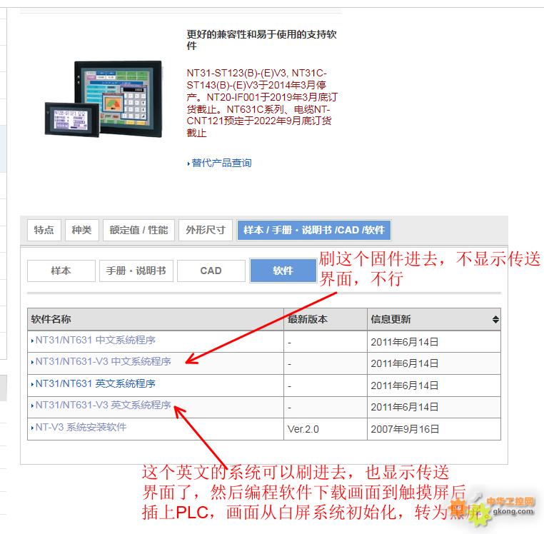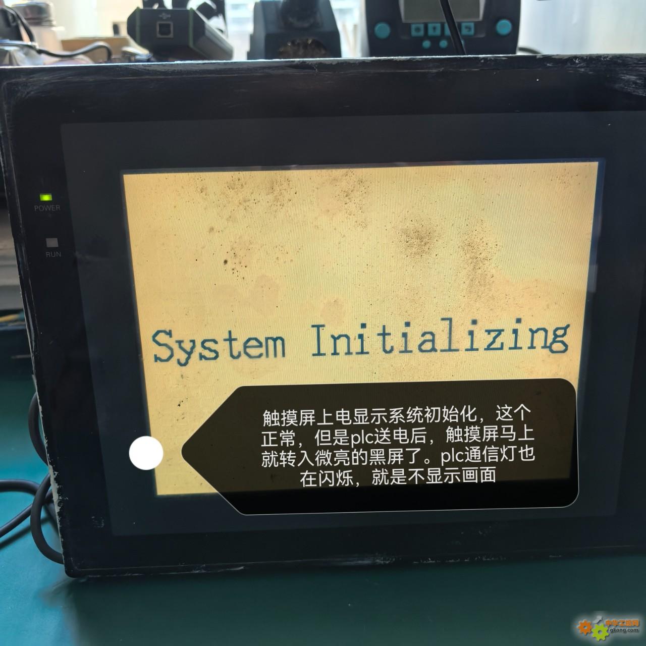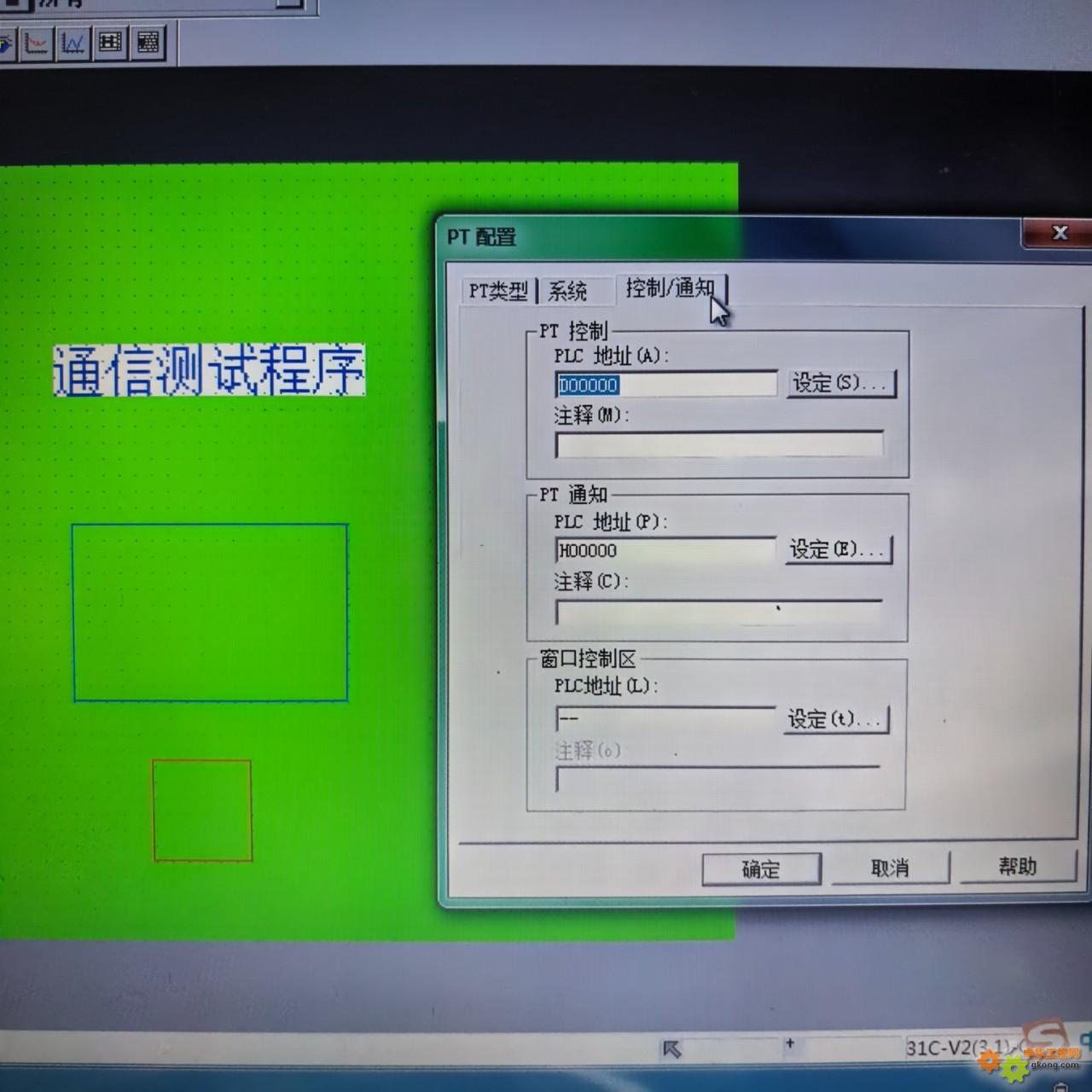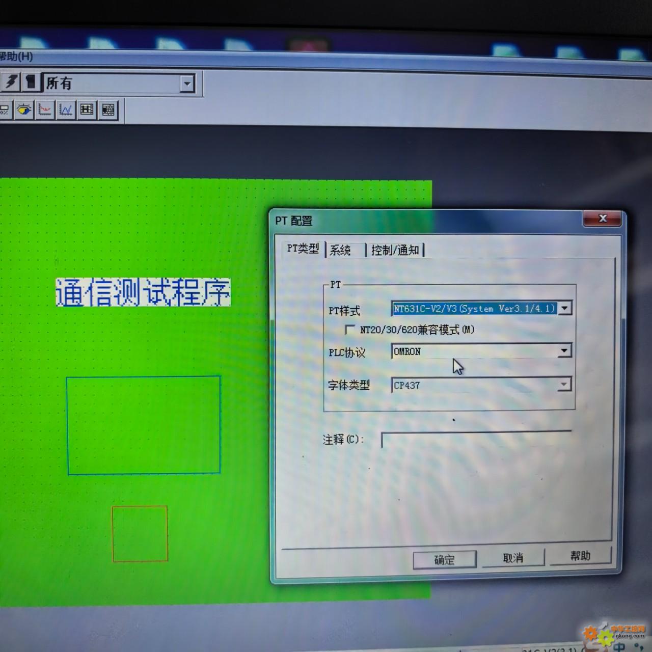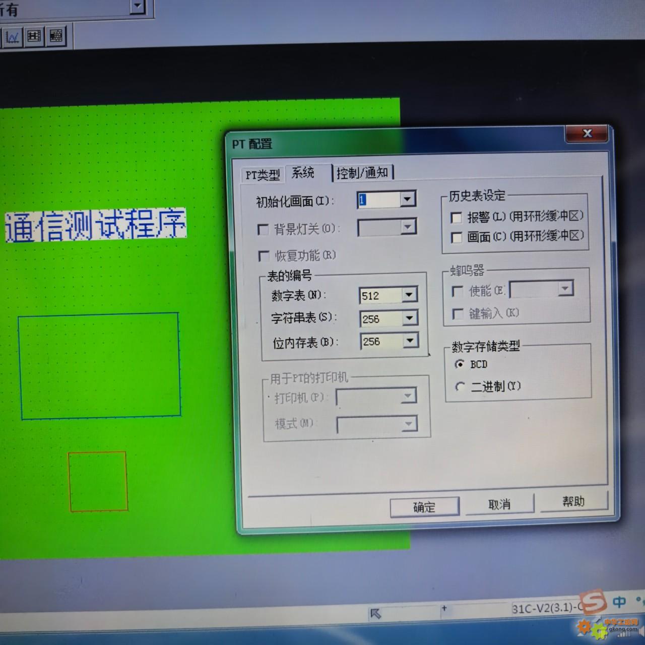 前辈们,这是欧姆龙一个老款的触摸屏型号是NT631C-EV3,因为固件丢失了,就官网下载了固件,更新中文的固件提示成功了,但是上电触摸屏白屏转黑屏不行,无法进入传输模式。又下载的英文的固件,可以刷进去,上电也可以进入传输模式了,然后我想建一个画面链接CPM2AH的PLC,测试一下,看看触摸屏画面能显示不,因为这个触摸屏不连接PLC上电是显示一个系统初始化的,我就用NTST4.8C中文编程软件新建了一个画面,写了几个字,然后软件下载到触摸屏时提示PT是英文系统,我就确认,可以下载进去,提示下载成功,然后我把PLC和触摸屏,通讯线序2--3 3---2 5---5的数据线,链接好后,PLC通讯的comm灯也在快闪,应该是链接成功了,但是触摸屏从白屏的系统初始化界面一下跳到微亮的黑屏了,我现在找不到问题了,是系统固件刷的不对?通讯线线序错了?NTST4.8C这个中文软件不行?还是触摸屏新建的画面建立错了,那个PT配置对不对呢,大家帮着看下。谢谢了。