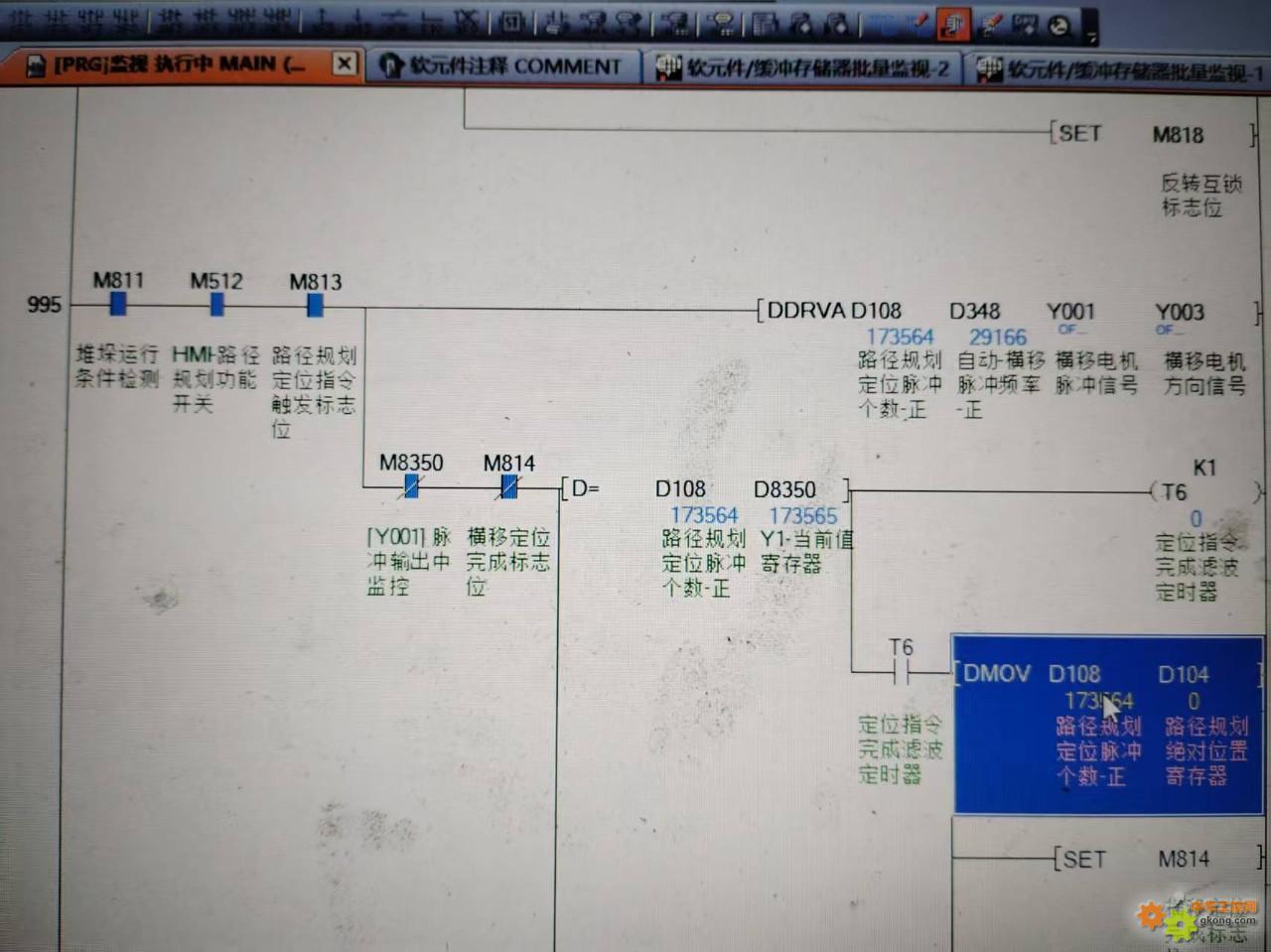 还有三菱的定位指令多个轴的情况下,怎么判断是那个轴的定位指令结束了?我之前是用LDF M8340 AND M8029,LDF M8350 AND M8029这样去判断,我手动可以,但自动程序有时候不清楚什么原因,会没有触发,然后现在改成了用比较去判断定位是否完成